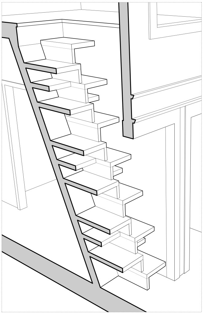 A stair would bring an ease of accessibility to the loft, but posed another problem in this small apartment: space. After sketching through many different stair types in different locations, an alternating-tread stair emerged as the logical choice. It was comfortable to use and took up little space.