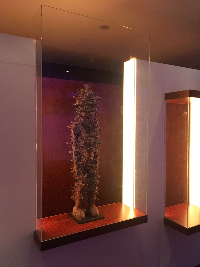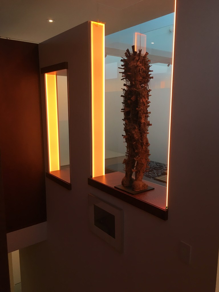 A series of freestanding, backlit sculpture niches and an alcove containing steel shelves detailed similarly to those in the Turquoise Room are directly adjacent to the lavatory. This area is meticulously detailed and carefully lit to highlight those objects displayed.