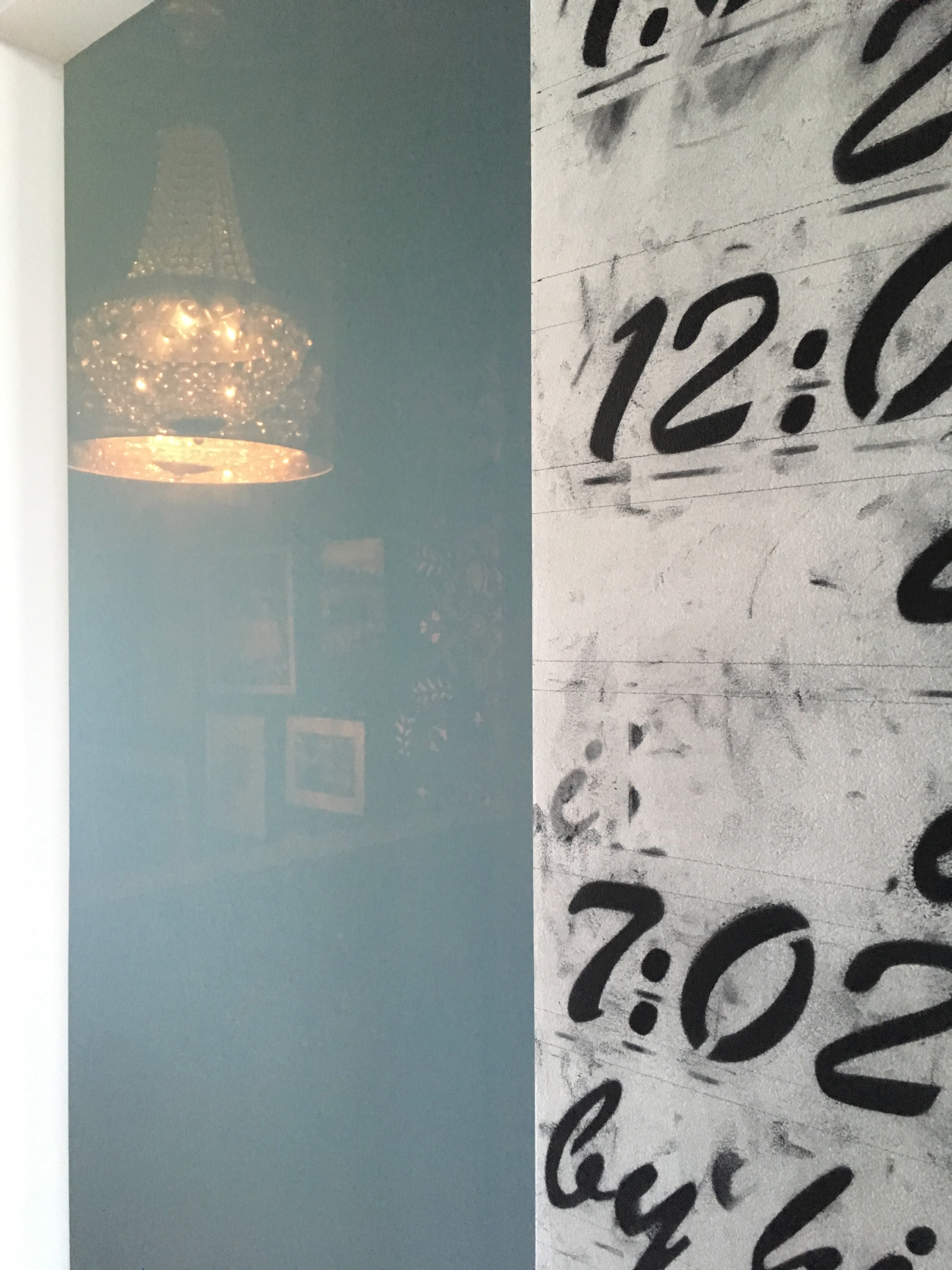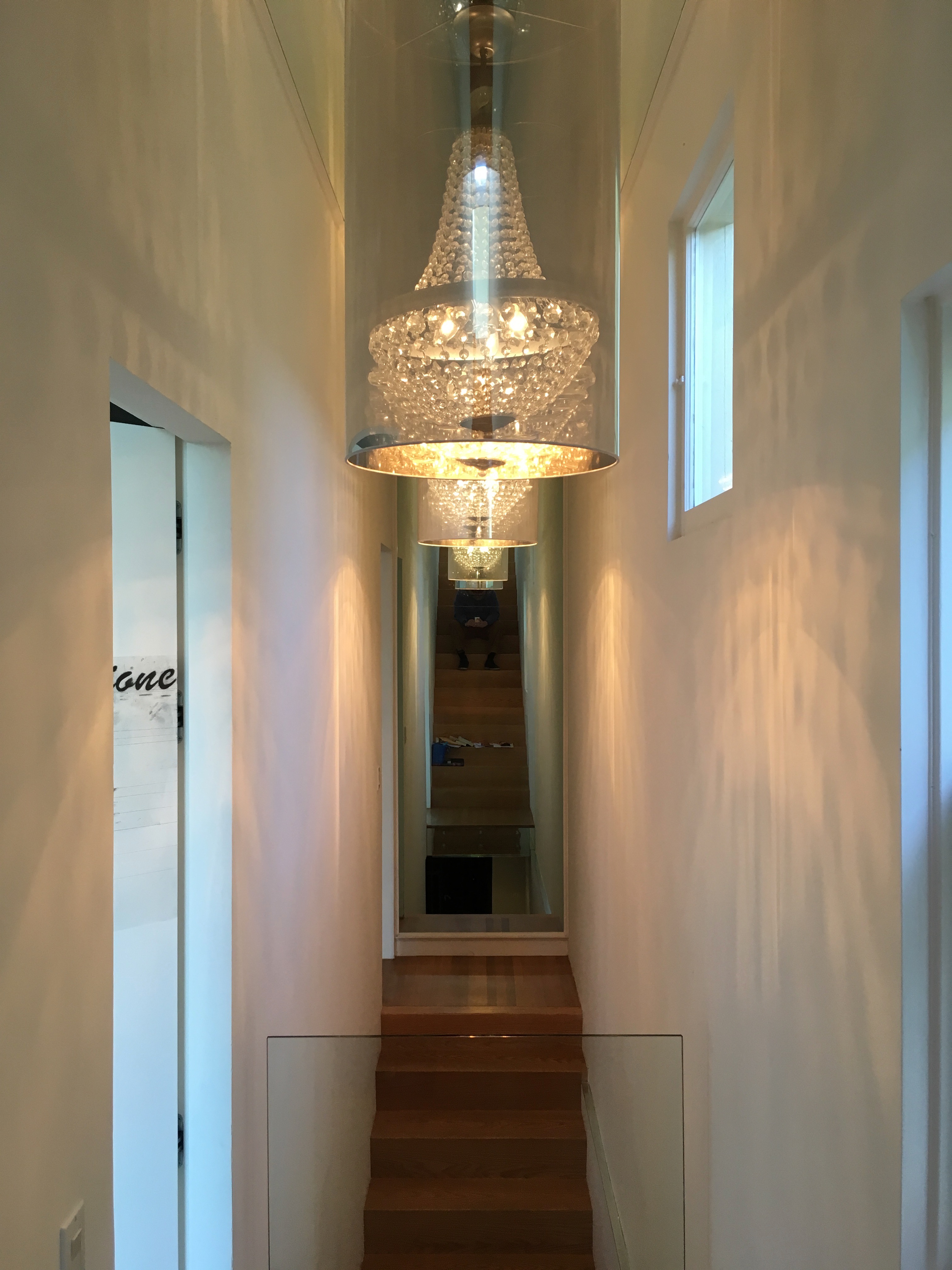 A series of Jurgen Bey-designed “Light Shade Shade” fixtures complete the visual connection between the two spaces. The powder room fixture is on a separate dimmer switch to provide bathroom users- especially those of a paruretic nature- control over privacy.