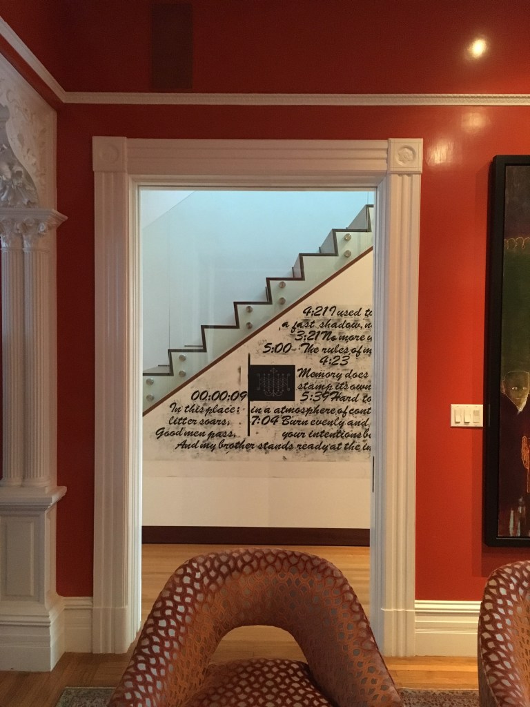Hidden behind a concealed door in a wall mural by Rodney Ewing and below the grand staircase, a powder room and a service stair take on a life of their own. Through the detailing of a partition between, the powder room is spatially integrated with the soaring vertical space of the service stair.