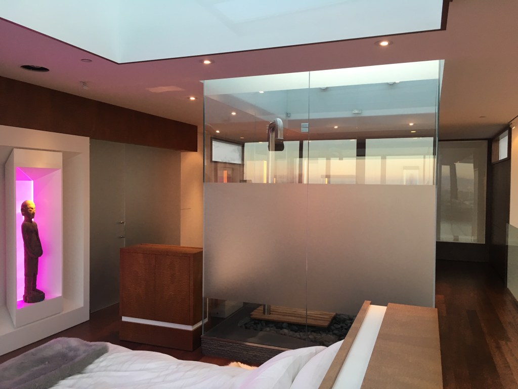 The master suite is fitted with colorable LEDs throughout. As the interior light changes, so follows the sky- per Josef Alber’s “Interaction of Color.” This deception of color is an extension of the “smoke and mirrors” play overall.