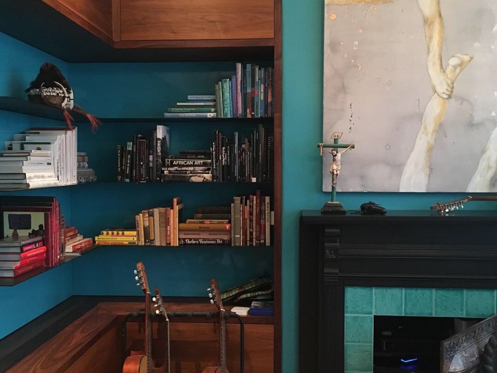 A former bedroom on the third floor was remodeled to become a multi-purpose den for watching movies, gaming, reading, and jamming. The photographs show details of casework in The Turquoise Room, comprised of automotive lacquered Trupan, blackened 11 gauge steel, and Brazilian Walnut.