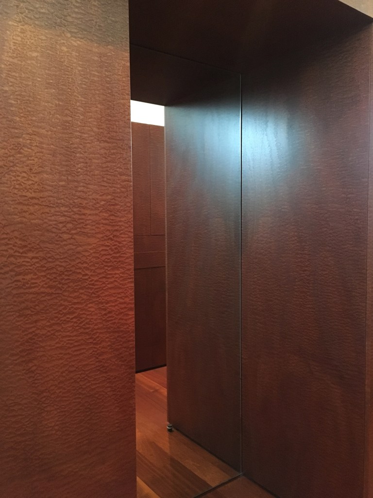 A walk-through closet employs doors made from exotic wood-veneered aluminum aircraft panels to ensure zero-warpage over the ten-foot height. A mirrored door to a hidden utility room amplifies the immersion of material in this compressed space. Opposite the back stair is a series of three side-lit sculpture vitrines that puncture a partial-height wall at varying degrees.