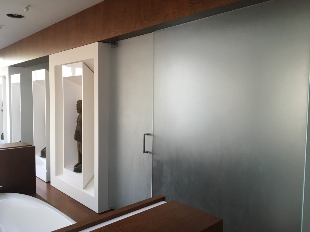 An open tub in a custom frame sits between the shower island and a water closet/lavatory space concealed by frameless etched glass. Whereas the shower etching reads as light and diaphanous, the lavatory glass picks up on the mottled antique mirror finish behind and reads as an almost titanium finish.